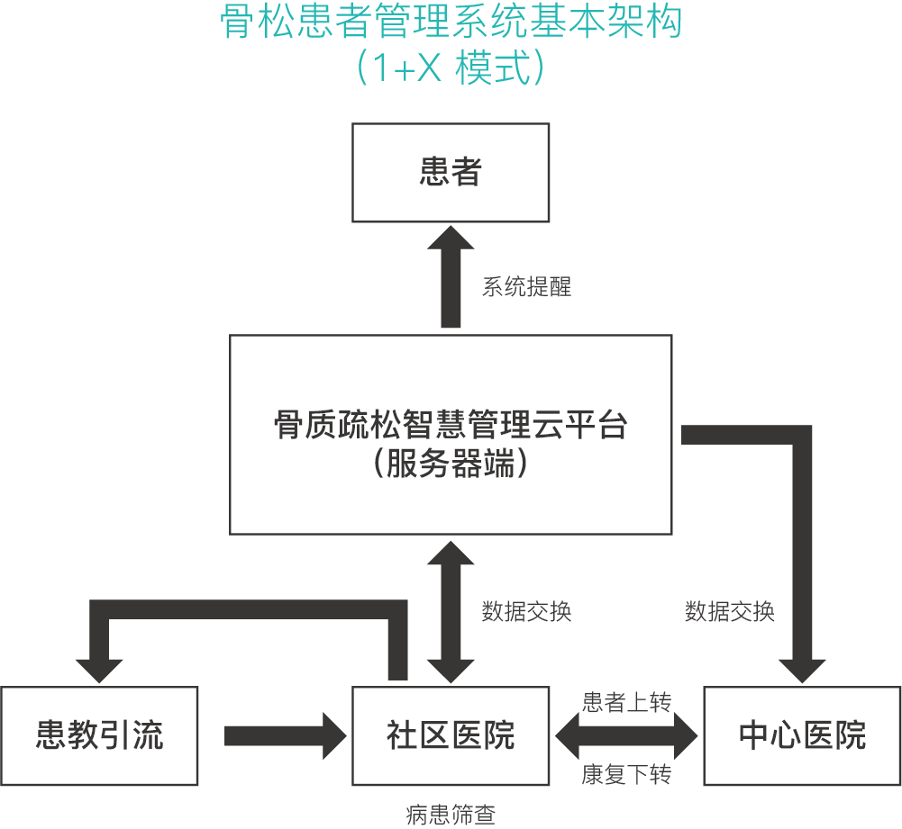 建立骨質疏松標準化診療技術和流程,開創骨質疏松患者管理新模式 建立遍布全國基層醫療機構骨質疏松特色專科,培養遍布全國基層醫療機構骨質疏松患者診療隊伍。最終形成全國總中心 -區域診療中心 -地市級診療中心 -縣級診療中心 -社區中心五級防控網絡。