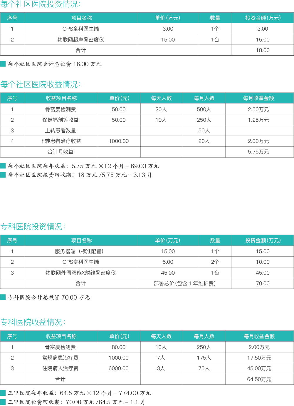 一個(gè)專科醫(yī)院與5~10家社區(qū)醫(yī)院聯(lián)合形成分級(jí)診療架構(gòu),現(xiàn)按最低5家社區(qū)醫(yī)院進(jìn)行投資收益分析。專科醫(yī)院配置2名骨松專科醫(yī)生、一個(gè)社區(qū)醫(yī)院配置1名全科醫(yī)生,社區(qū)醫(yī)院要求每天完成骨密度篩查最低20人任務(wù)量,上轉(zhuǎn)人數(shù)按10:1即每個(gè)社區(qū)醫(yī)院每天上轉(zhuǎn)2人,下轉(zhuǎn)人數(shù)按5:2,即專科醫(yī)院接收社區(qū)醫(yī)院上轉(zhuǎn)5人經(jīng)治療后下轉(zhuǎn)2人,每月按25天計(jì)算,基于這些情況進(jìn)行的投資收益分析: